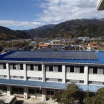 自然エネルギーを活用したまちづくりの一環と、避難所として位置づけられている河津中学校の平常時の二酸化炭素排出の抑制、災害時に停電になった際に電気の供給を可能とすることを目的に太陽光発電設備と蓄電設備を整備しました。低炭素化と防災対策を同時に実現できます。平常時は発電した電力を施設内で使用し、停電時には避難場所である施設内の照明や、非常用コンセントへ電源供給ができます。教育現場に太陽光発電を導入することで、環境保護の意識啓発にも役立っています。