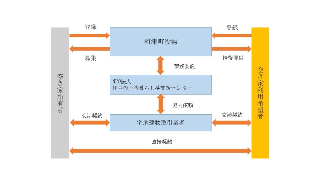 空き家の情報は、河津町より委託を受けたNPO法人伊豆の田舎暮らし夢支援センターもしくはNPO法人伊豆の田舎暮らし夢支援センターが依頼する宅地建物取引業者が物件調査の上、取扱い可能な物件であれば、河津町に報告し、空き家バンク情報として公開します。